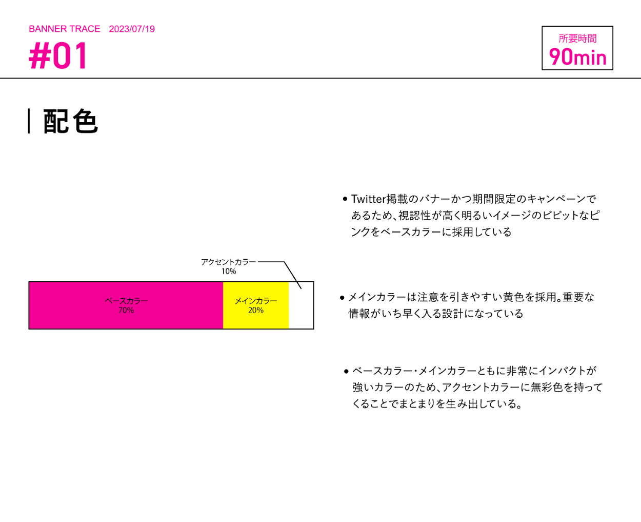 情報が正しく伝わるようにフォントサイズを調整している点や、一緒に見てほしい部分は同じ色でまとめているなど、情報量が多い中でも正しく情報を受け取ってもらえる工夫を配置とカラーリング、あしらいなどから分析し、言語化しました。