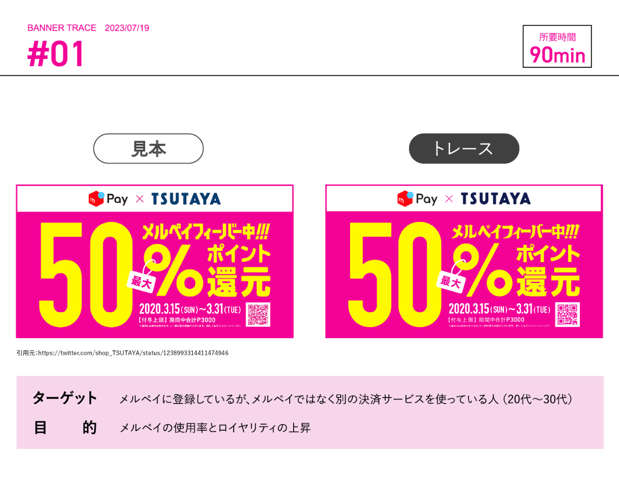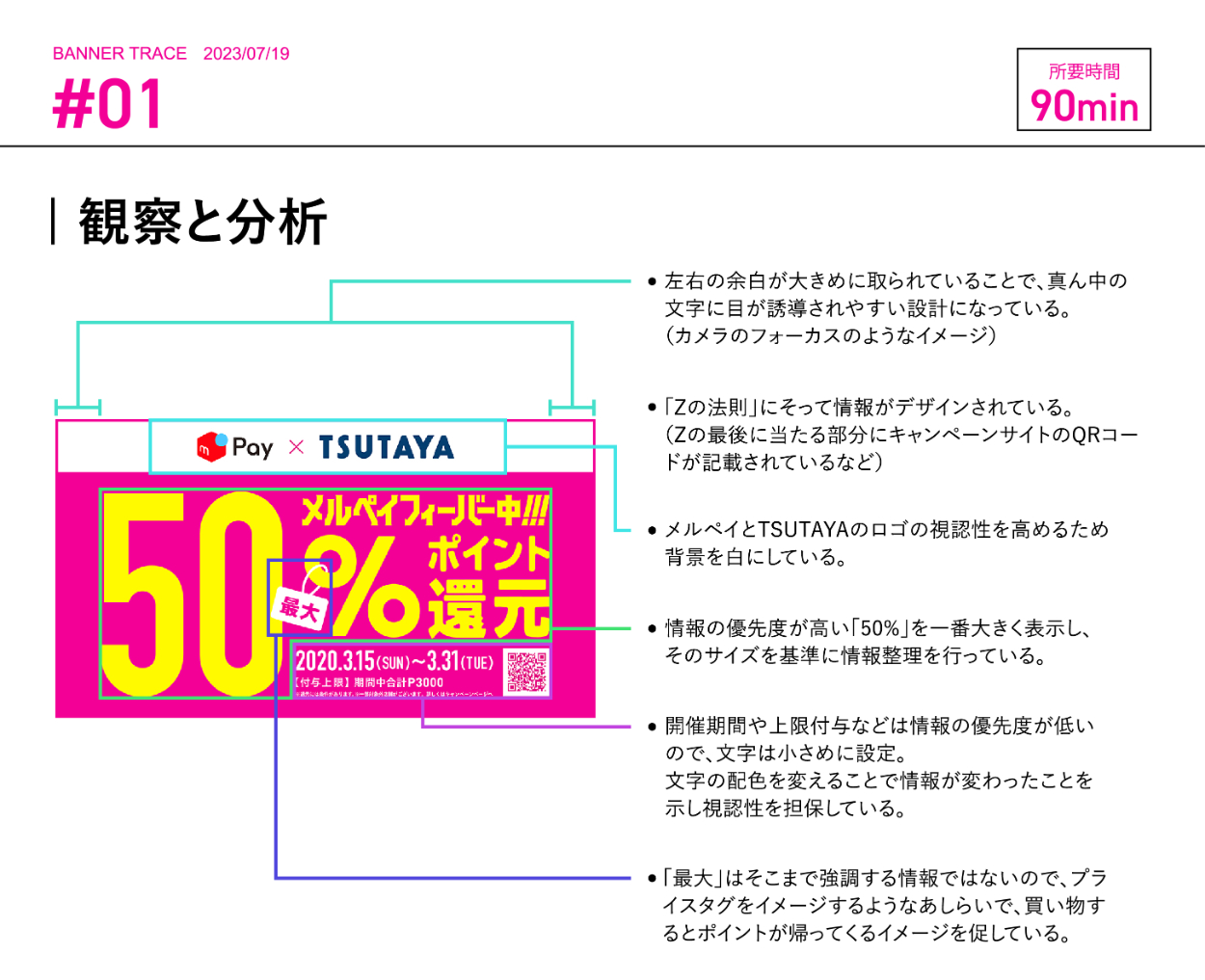 情報量の多いバナーであるため、どのように情報設計をしたのか注目し、分析しました。「50%ポイント還元ができる」という一番伝えたい部分が軸となり配置が設定されていることや、ユーザーの目線の流れに合わせ、右下にQRコードが設定されているなど、ユーザーストーリーを想定しながら分析を進めました。