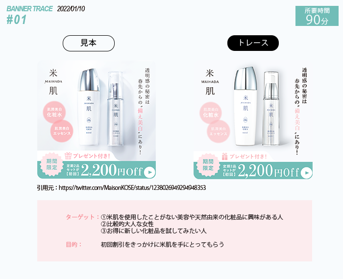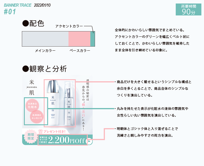 バナー下部の告知文章は、明朝体とゴシック体の併用を。背景のフレーム箇所は曲線と直線が併用されていることを分析から気付きました。