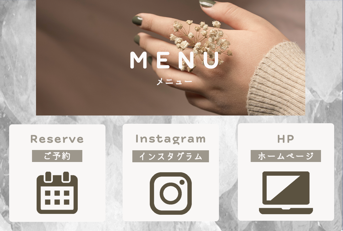 LINEリッチメニュー chiaki アクセサリーSHOPのECサイト運営業務 ■クライアントの要望シンプルだけど華のあるデザインでお願いいたします。メインターゲット:20台後半〜30台女性■クライアント:「SHE nail」様(架空:ネイルサロン)※店名は入れなくてOK