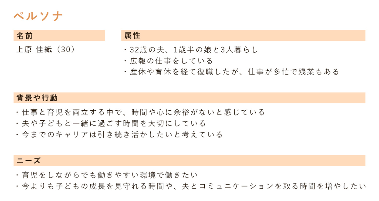 TSUTSUMUのターゲットは「TSUTSUMUの世界観に共感してくださる方」「カルチャーフィットしている方」とされていました。また、TSUTSUMU株式会社から提示された文章の中に「ママの育児をサポートしたい」「家族みんなが幸せになる」と記載されていたことを踏まえ、ペルソナは家族と過ごす時間を大切にしている人物であり、育児しながら働きやすい環境を求めている女性を設定しました。