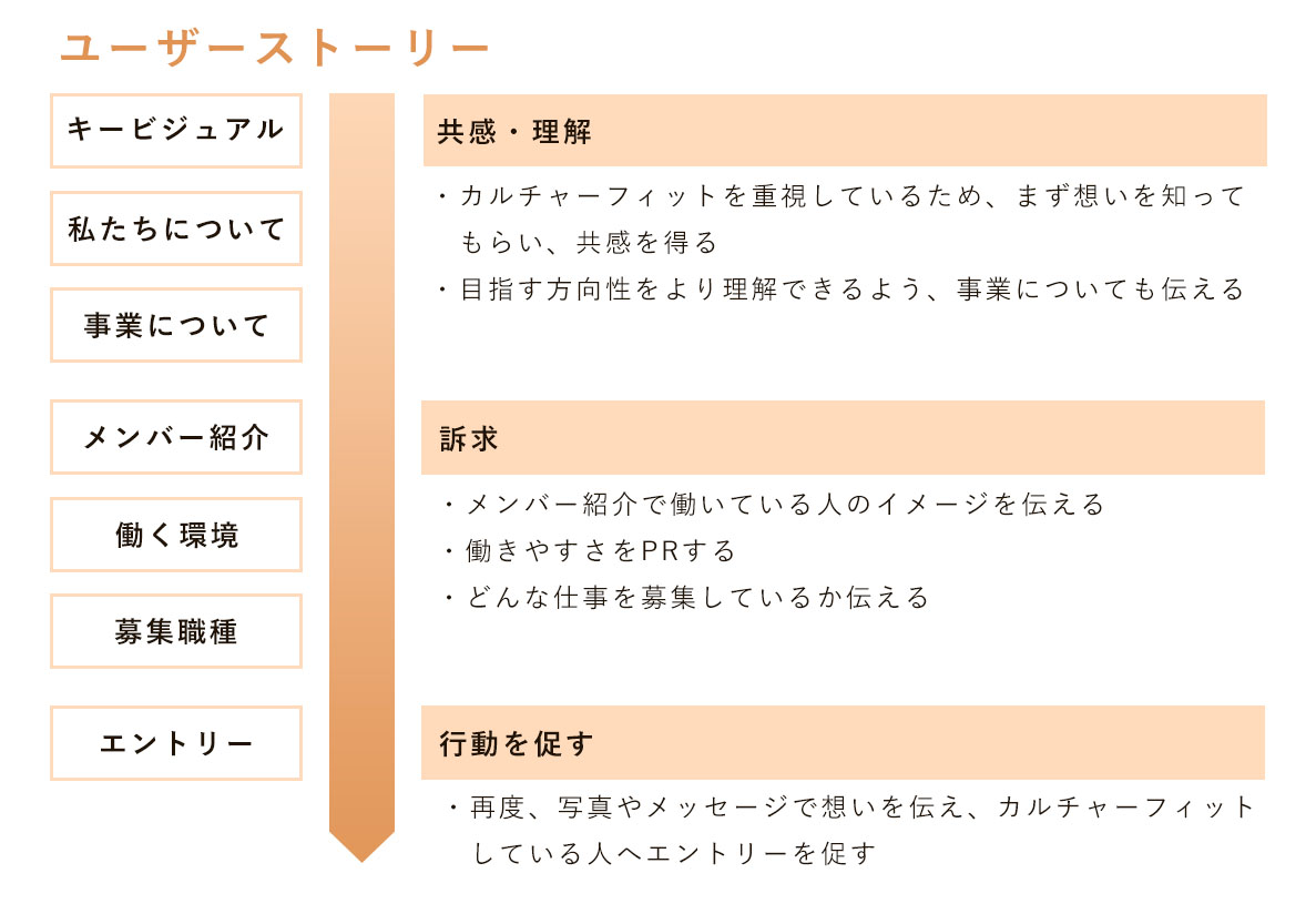 今回のLP制作の目的は「カルチャーフィットしている方に応募してもらう」ことであるため、TSUTSUMU株式会社の想いが伝わることが重要だと判断し、「私たちについて」や事業内容については冒頭に配置しました。