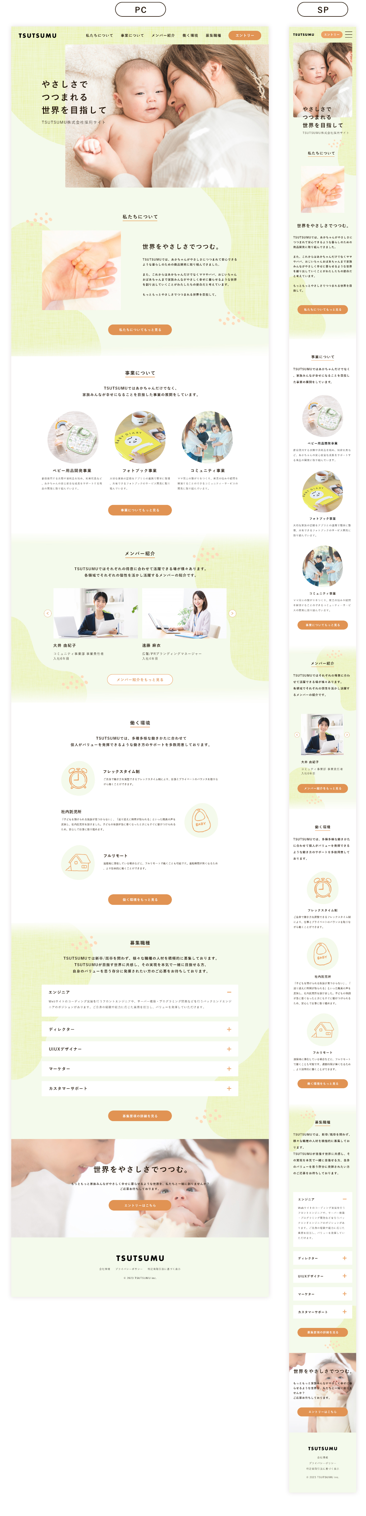 カルチャーフィットしている人がターゲットであるため、TSUTSUMUの想いを表現できるコンセプトにしようと考えました。セクション「私たちについて」に記載されている「あかちゃんがやさしさにつつまれて安心できるような暮らし」から連想して、これらのキーワードを考えました。