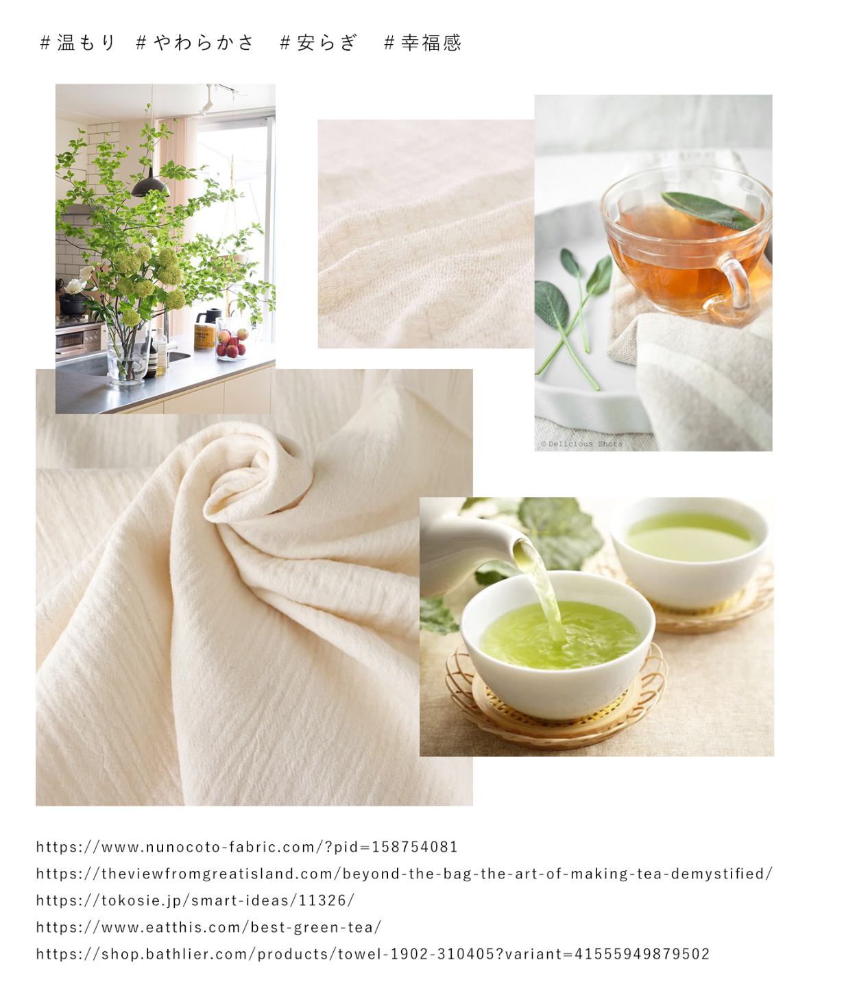 上記のキーワードを踏まえ、やわらかい布や、温かくてホッとした気持ちになりそうなお茶などをイメージしました。