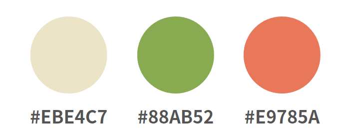 ベースカラー(#EBE4C7):メインカラー(#88AB52):アクセントカラー(#E9785A)