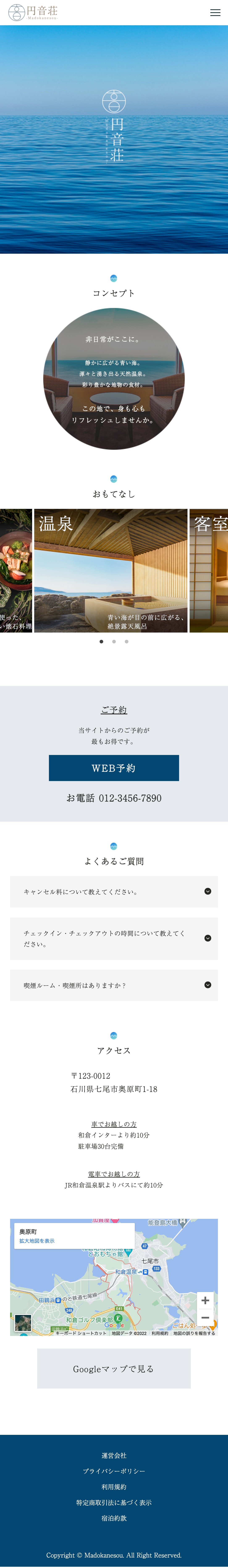 ・宿の名前にも含まれている「円」という字からも連想されるように、コンセプトのセクションでは館内写真を円形にトリミングし配置しました。