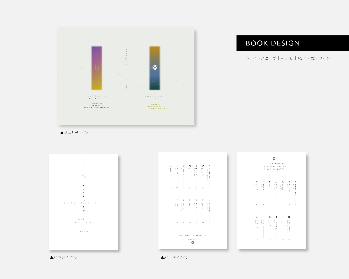 表紙に入れたたなびくような曲線は、カーテンの裾を簡略的にイメージ。また、三角形を組みあわせた六角形は、タイトル「カレイドスコープ」から万華鏡の中身のイメージを表現しました。