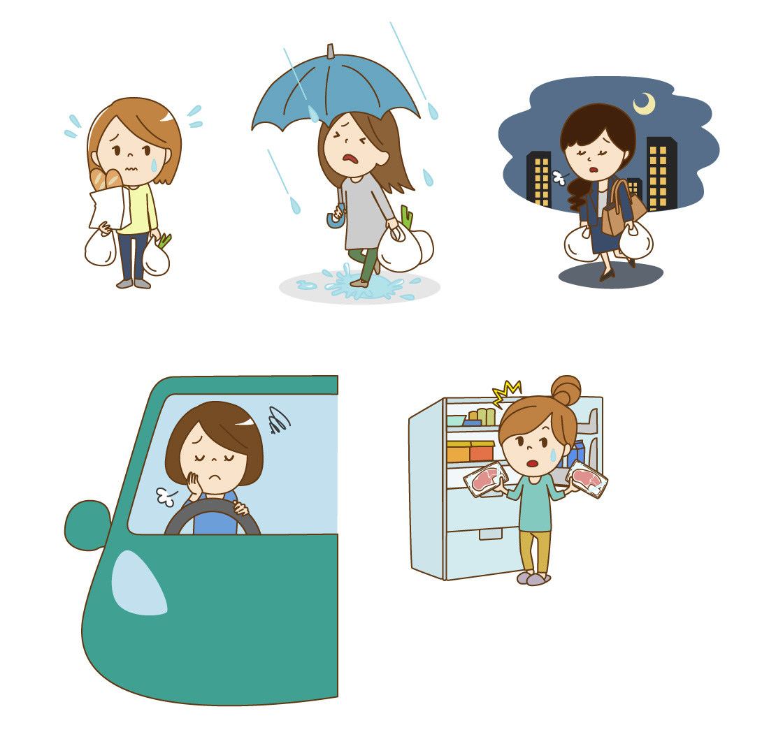 ネットスーパー訴求用イラスト dhara Webデザイナー OVERVIEW ネットスーパーの訴求バナーに使用するイラストの制作 YEAR 2015 スーパー利用時に困った体験を連想するイラストを制作荷物が多い雨の中スーパーへ行くのは大変仕事帰りにつかれているのに荷物が重い駐車するのが面倒同じものを購入してしまった