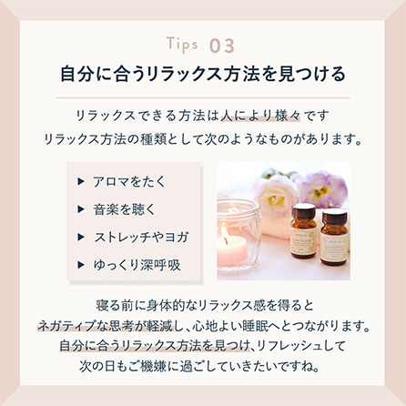 ・Tips3で様々なリラックス方法として、▶で箇条書きにしてBOXにまとめることで、視覚的に見やすい様にしました。