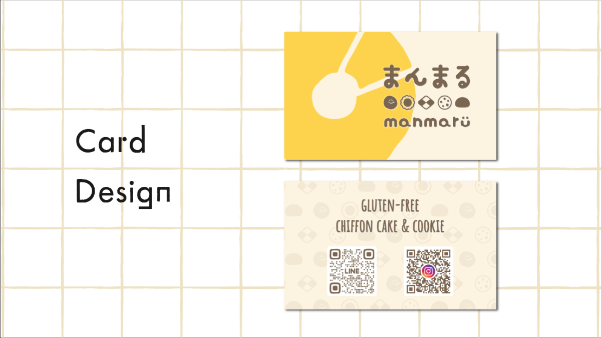 米粉のシフォンケーキやおやつをマルシェで販売したり、 オンライン講座を開講している【まんまる】さまのショップカードを 制作させていただきました。