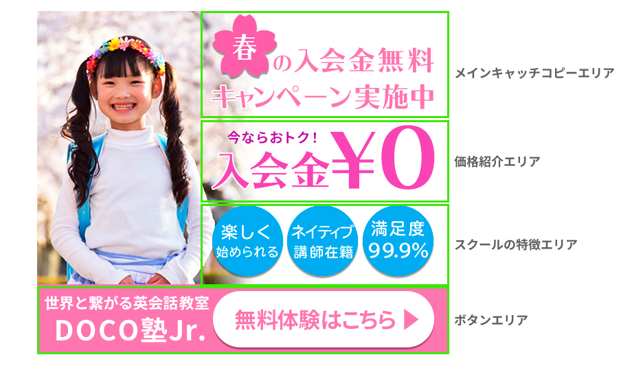 ・一番訴求したい「¥0」を大きくし、濃いめのピンクで目立つようにした