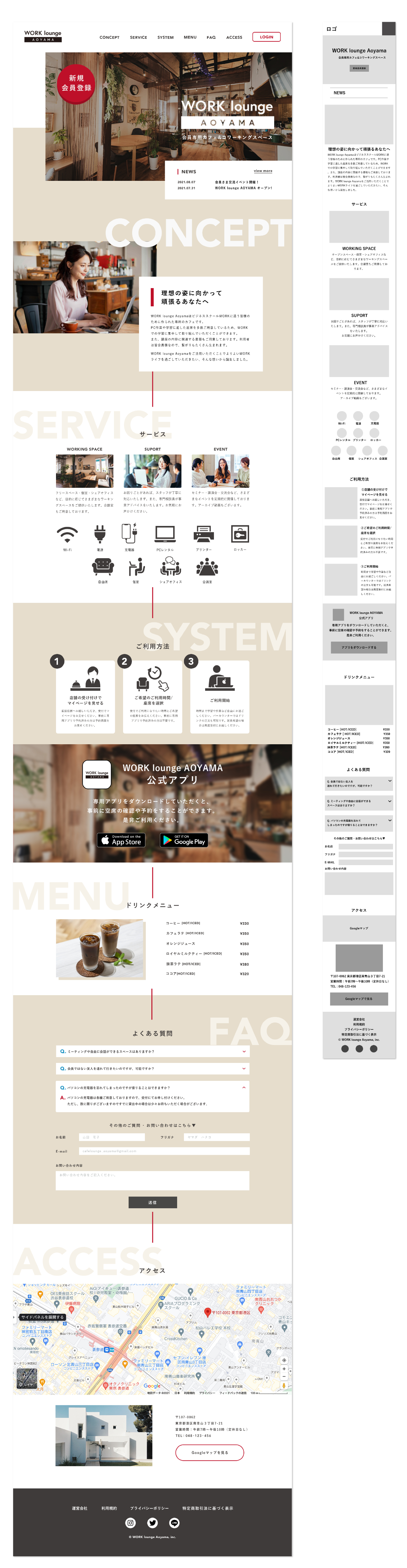 SHElikes MULTI CREATOR COURSE 4つ目の課題 LP制作です。 架空のコワーキングスペース&カフェのLP制作依頼です。PCデザインカンプとSPワイヤーフレームを作成しました。 [制作時間:40時間 / 制作期間:3週間/使用ツール:Photoshop]