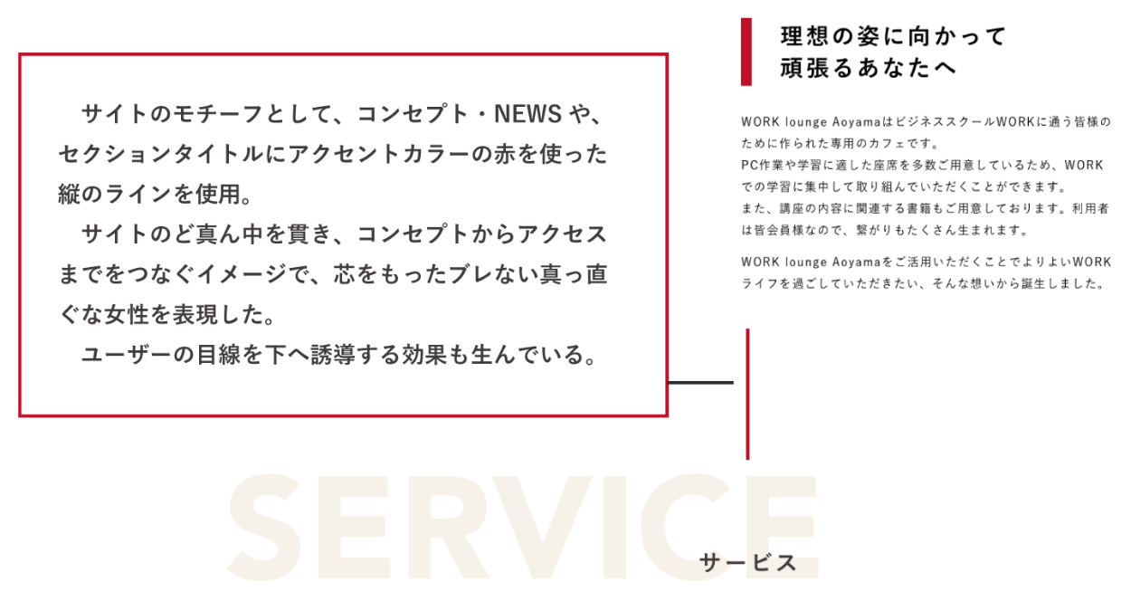 「WORK lounge AOYAMA」の提供するカフェ&コワーキングスペースとしての心地よさと、ターゲット女性の向上心やキャリアアップへの意欲を、サイトデザインで表現。