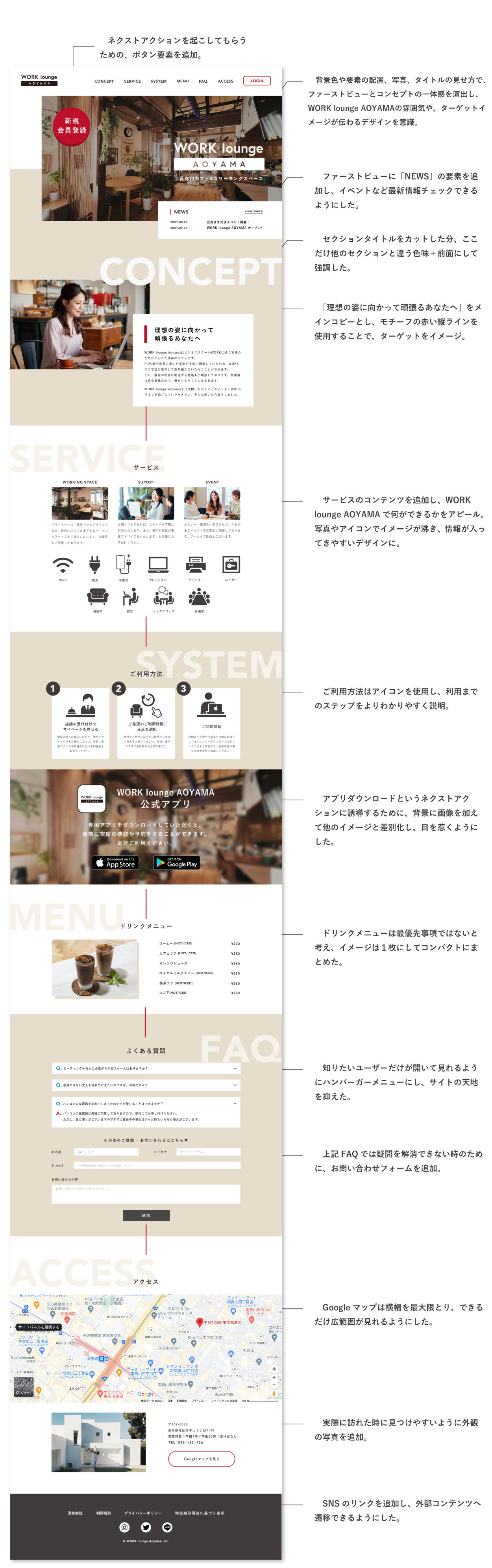 ユーザーに「WORK lounge AOYAMA」を選んでもらうための、アピールポイントとしてセクションに追加。サービス内容・設備を記載。目的にマッチしているかをユーザー側も確認できるセクション。