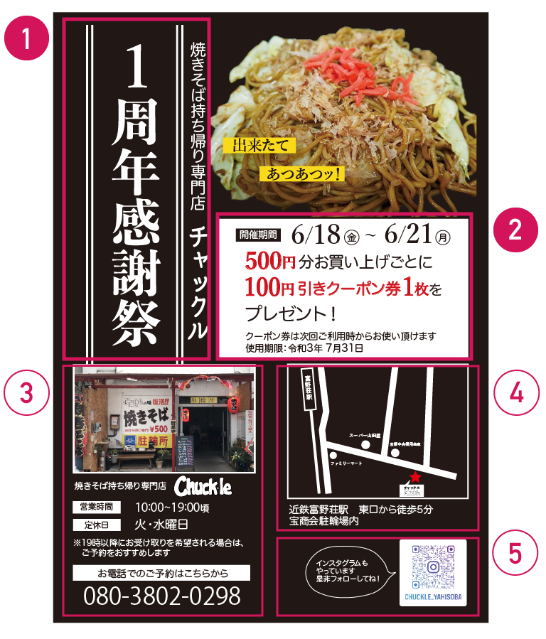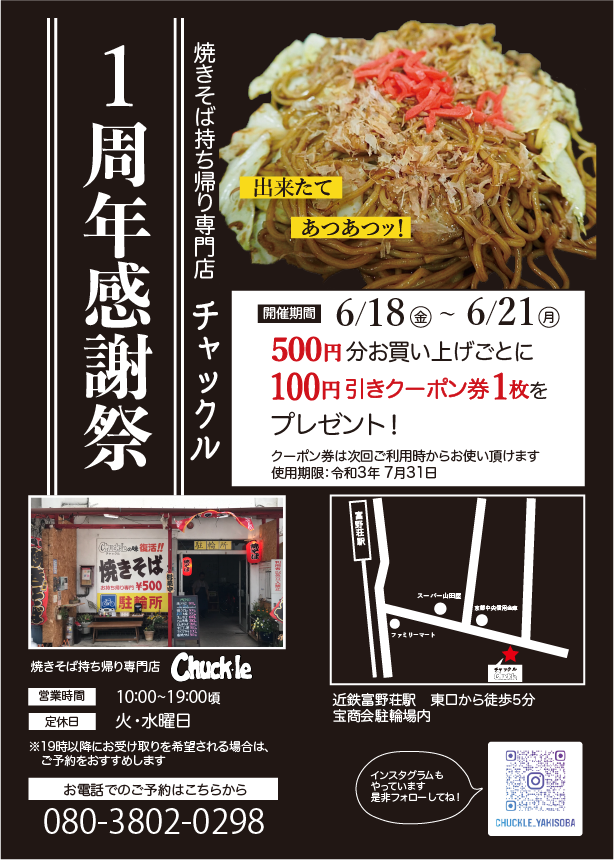 焼きそばchuckle様からの依頼で、開業1周年記念イベントを告知し、さらに認知を広げるためのフライヤーを制作しました。