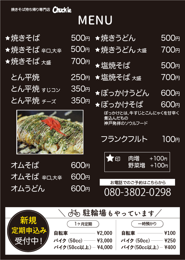 15年前に閉店した喫茶店chuckleの店主が、人気だった鉄板焼きメニューを持ち帰り専門chuckleとして去年復活させた。焼きそばなど全てのメニューを作り置きをせず出来立てをお持ち帰りしてもらうことを売りにしている。店舗は同じく経営している駐輪場の敷地内にある。