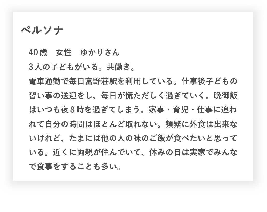 要件としてのターゲットは老若男女全てでしたが、範囲が広すぎるとデザインの方向性や判断基準が定まらないので、この様な詳細なペルソナを立ててデザインをしていきました。デザインがある程度できてから、シニアの方が分かりやすいかを基準に調整していきました。