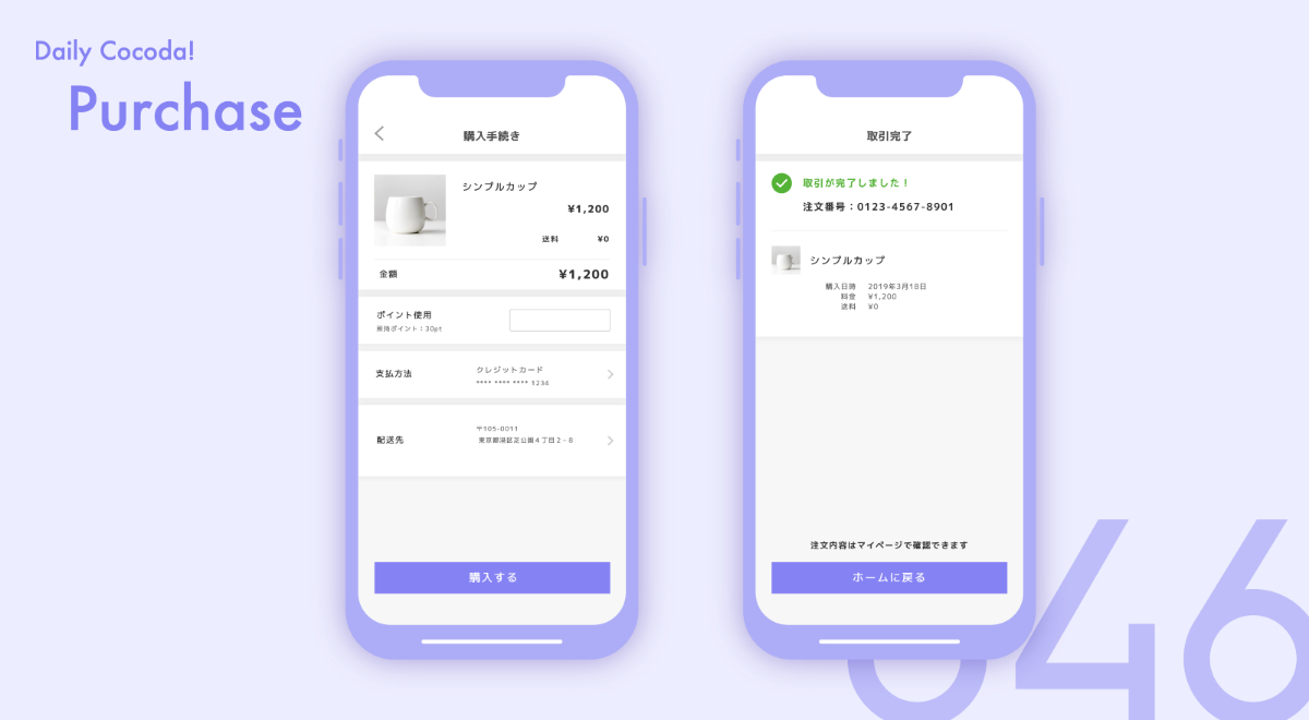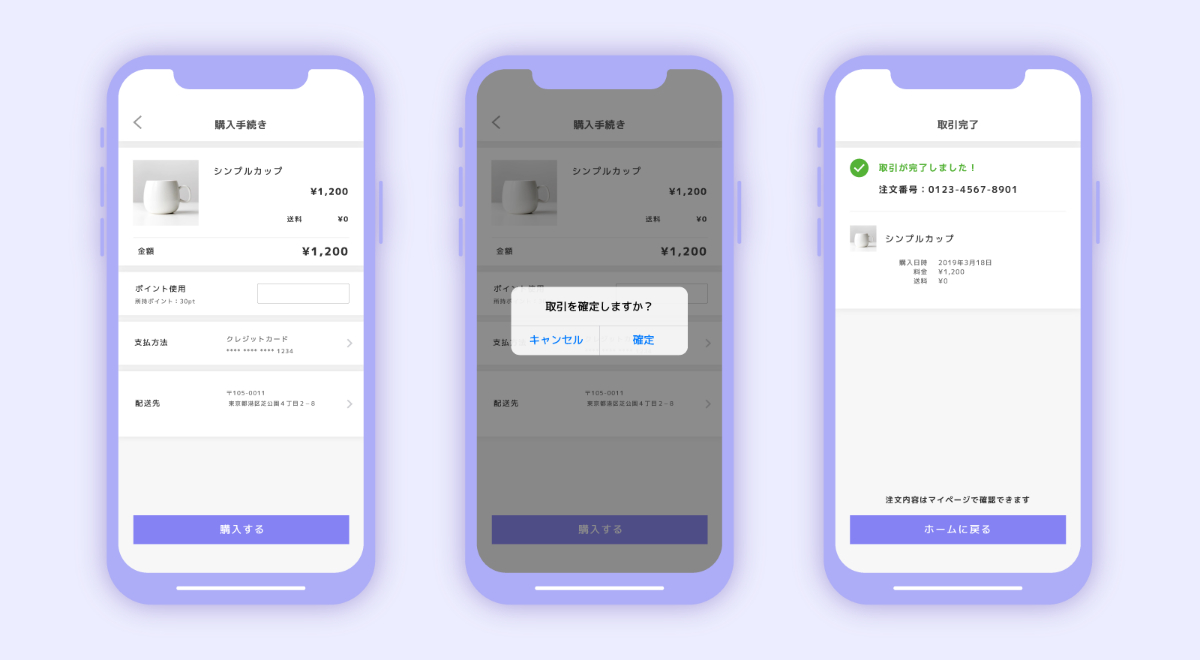 フリマの商品購入はネット通販と違い、1つの商品ごとに購入するので、あまり確認画面を増やさないようにしました。