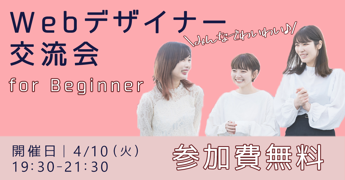 必要な要素:「Webデザイナー交流会 for Beginner」「みんなでわいわい」「開催日:4月10日(火)19:30-21:30」「参加費無料」