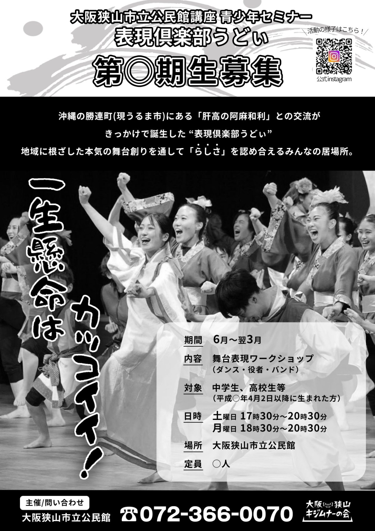 チラシ制作(自主制作) maya 複業Webデザイナー OVERVIEW 表現倶楽部うどぃのチラシ制作 小中高生をターゲットとして、メンバー募集のチラシになります。白黒印刷ということでモノクロで制作しました。