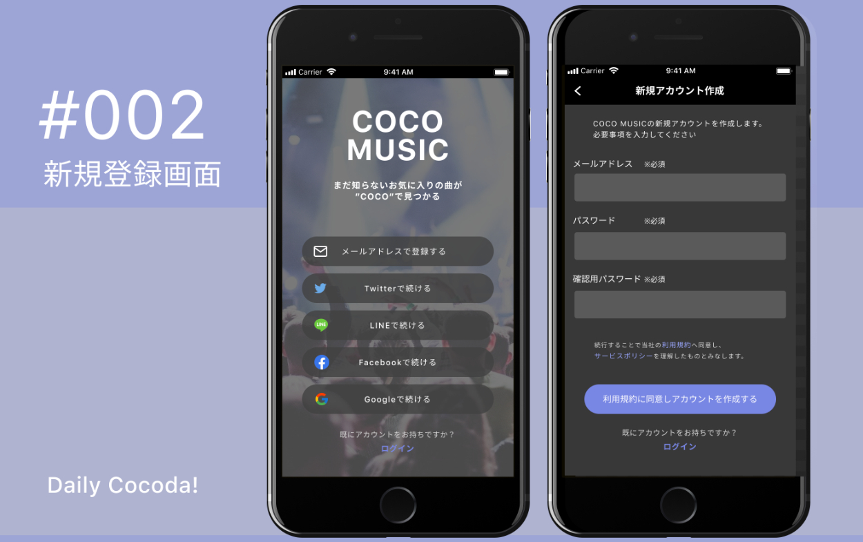 【UI】新規登録画面 shoichi ishida UI/UXデザイナー OVERVIEW Cocoda!の課題で作成した音楽レコメンドアプリの新規登録画面です。 ツール:Figma YEAR 2020