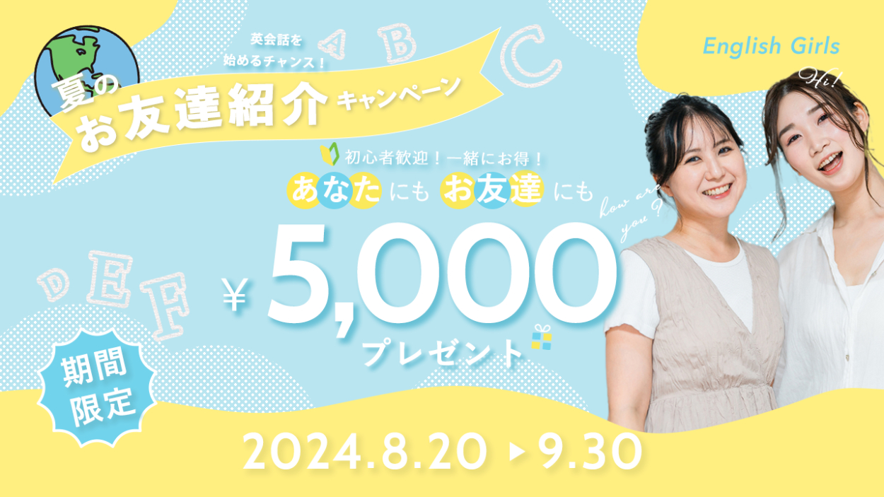 お友達紹介キャンペーンという文字と5000円という文字がパッと目に入り、気になってよく見てみようとした際に、Zの法則で視線を誘導し、「お友達紹介キャンペーン」→「English girls」→「あなたにもお友達にも5,000円プレゼント」→「期間限定+2024年8月20日〜9月30日」という流れで読んでもらうと、キャンペーンの内容が理解でき、詳しい情報を見るためにLPを見てもらえると考えました。