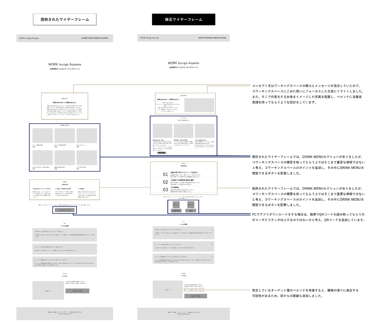 今回の課題では事前にクライアントからワイヤーフレームが提供されている想定で取り組んでいます。クライアント側のワイヤーフレームをもとに、より伝えたい情報や魅力が伝わるようワイヤーフレームを独自に設計し直し、SP用のワイヤーフレームも作成しています。