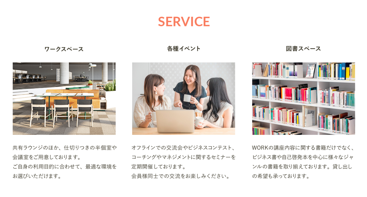 ビジネススクールWORKの非会員の方にWORKがどんなスクールなのかを知ってもらえるよう、CONCEPTのセクションとフッターにこちらのリンクとボタンを追加しました。