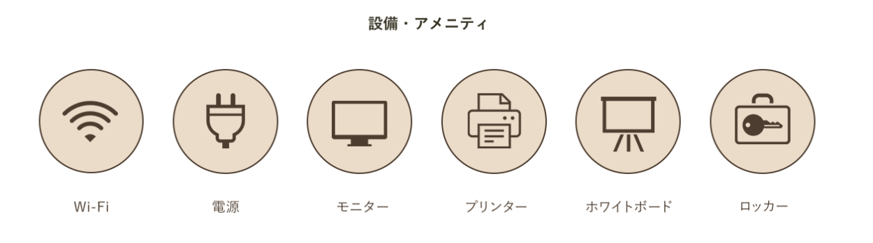 コワーキングスペースで利用できる設備や備品をアイコンで提示し利便性を伝えるのはもちろん、「安心して勉強や仕事に集中できそう」と感じてもらい、ユーザーの利用を促しています。
