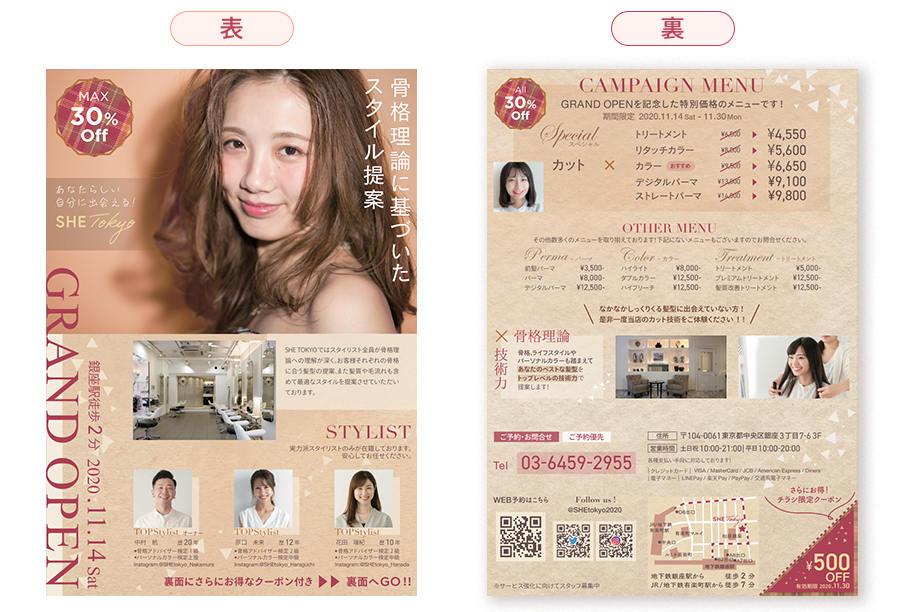 ・裏表どちらから見るかわからないため、キャンペーン情報や「骨格理論」というキーワードは表裏両方に配置した。