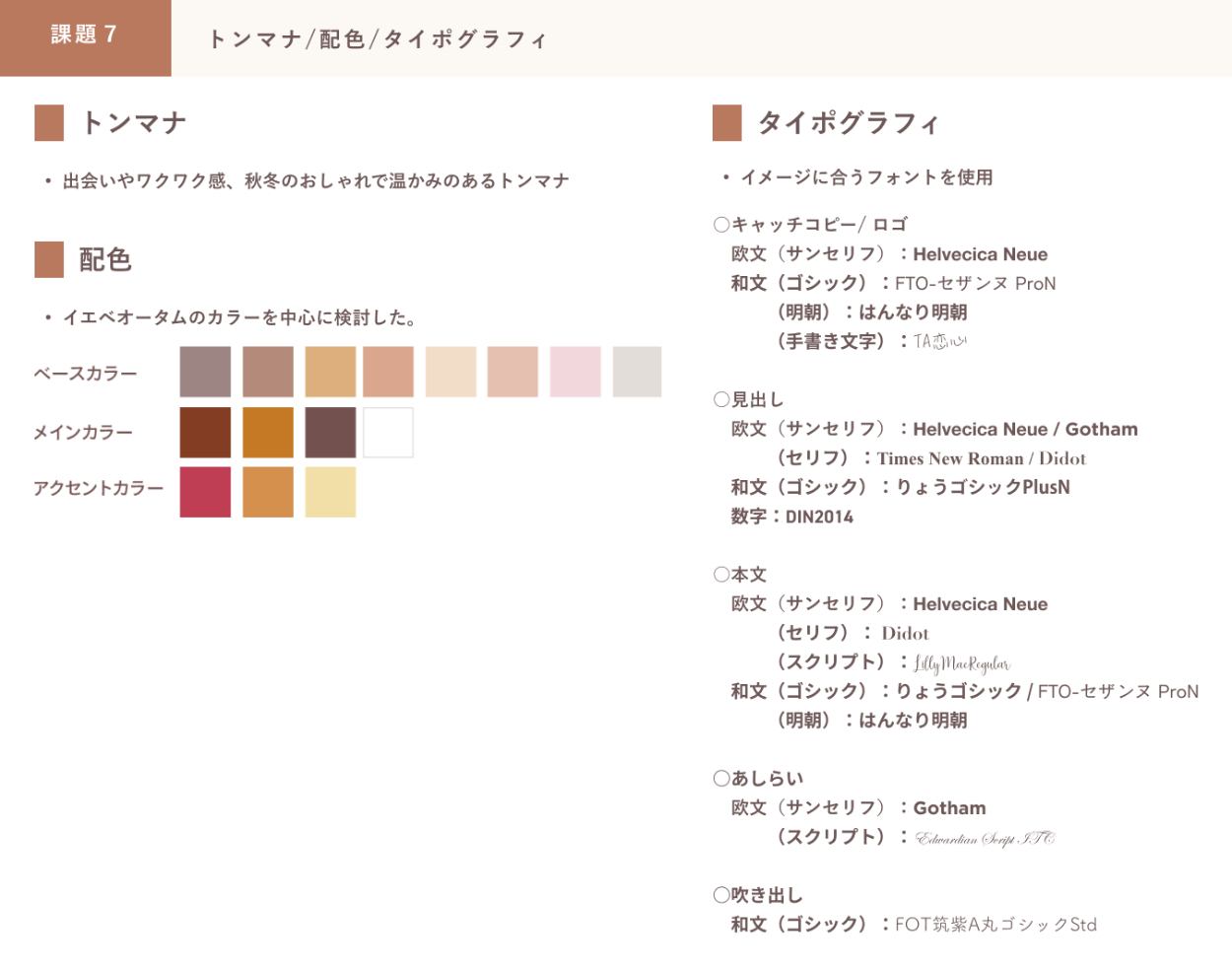 分析した結果を踏まえて、トンマナ/配色/タイポグラフィを検討した。