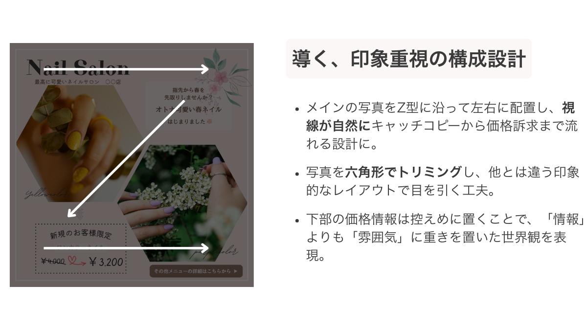 「指先から春を、先取りしませんか?」 トレンド感と季節感を大切にした春ネイルのキャンペーンバナーを、Canvaで制作しました。 写真の配置や配色にこだわり、上品で華やかな印象を目指しています。