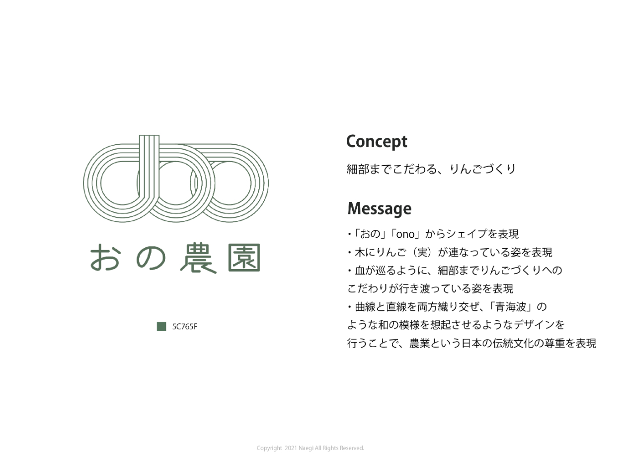 田舎館村の特長である「田んぼアート」「田」を下部に配置しました。また、幹の太い木を配置することで、「りんごづくり」に対する力強い想いも込めました。