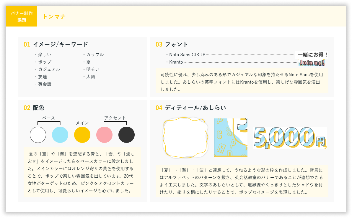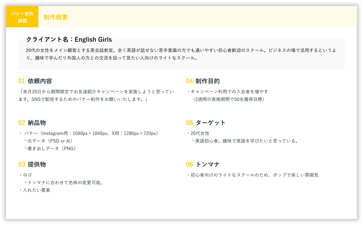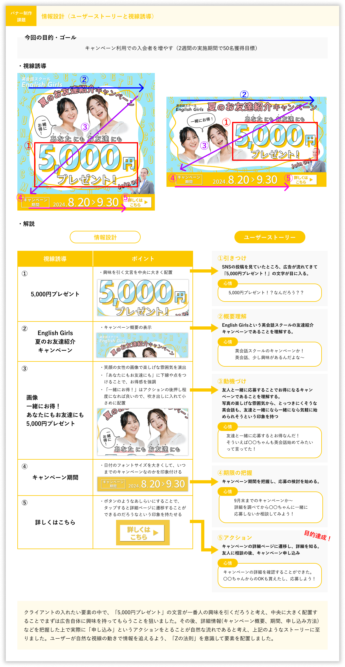 SHElikes MULTI CREATOR COURSEの実践課題として、架空英会話スクールのキャンペーンバナーを制作しました。クライアントからの依頼書をもとに、情報設計とビジュアルデザインを行いました。