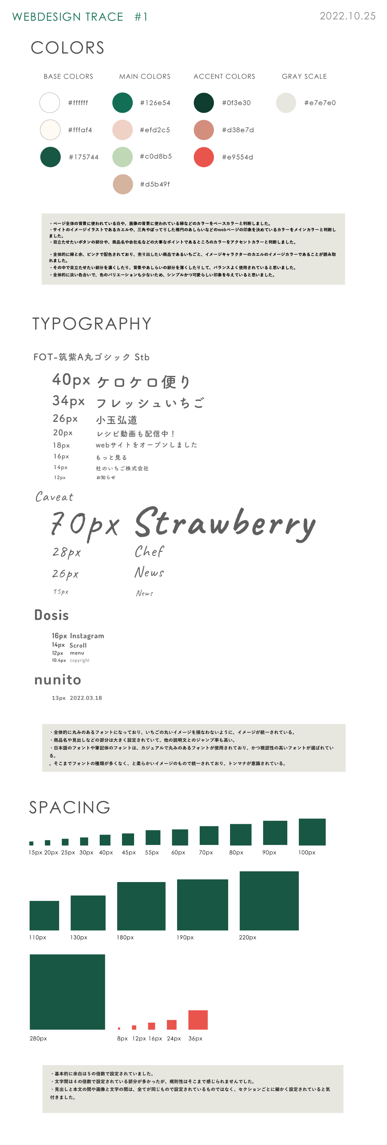目立たせたい要素はフォントサイズや太さが大きく太く設定されていて、見出しや商品名などは、他の説明文などの要素と比べるとジャンプ率も高く、可読性を上げていることがわかりました。英語、日本語共に丸みのあるフォントが使われており、いちごの丸いイメージと合わせて設定されているのではないかと考えました。