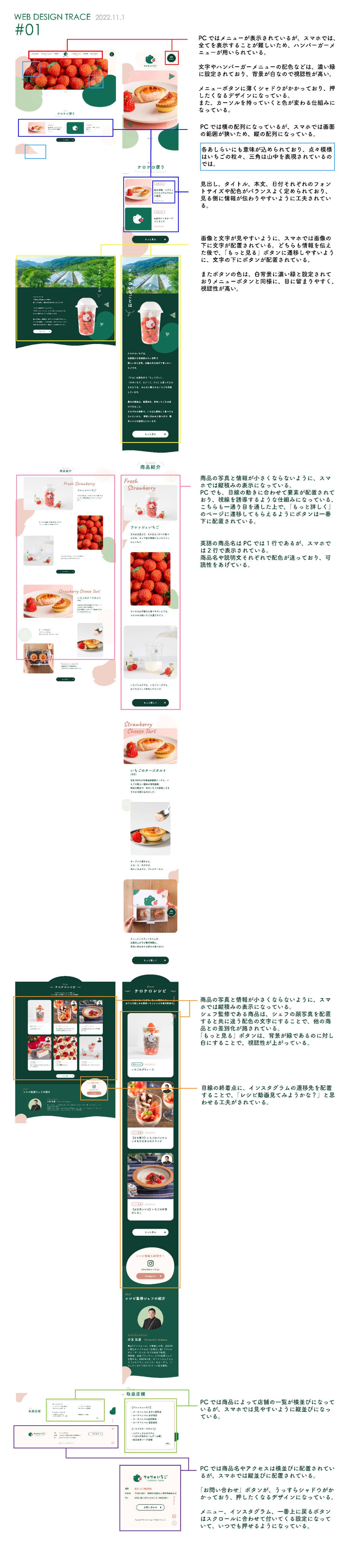 目立たせたい箇所をどう目立たせるか、行間や余白はどの程度に設定すると見やすいか、などの感覚を掴めるようにページをよく観察して、PCとスマホでのレイアウトの違いも細かく分析することに努めました。