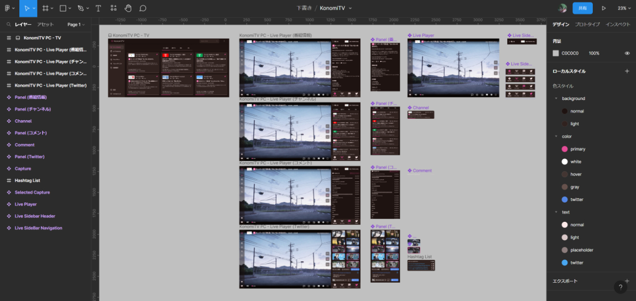 スクリーンショットにある範囲のデザインは2021年の5月~8月ごろに作成しました(その後も実際の実装に合わせて少し調整しています)。さすがに毎回機能を付け足すたびにデザインの方にも反映していては手間が膨大になってしまうため、ある程度イメージがまとまってからは HTML / SCSS を直接編集してデザインを調整しています。