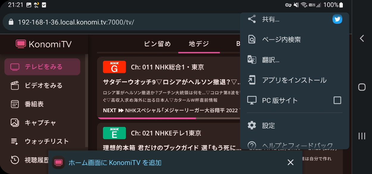 PWA (Progressive Web Apps) に対応しているため、PC や Android では KonomiTV を [ホーム画面に追加] することで、まるでネイティブアプリのような操作感で使えます。