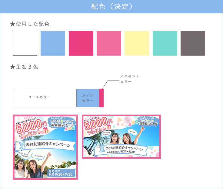 ・夏らしさや女性らしさがあるバナーから色を抽出して使用してみた。最初は柔らかい、彩度の低い色を使ってみたが、文字が見にくく、印象が弱かった。彩度があり、色がはっきりしている方が文字が伝わりやすく、目に留まりやすかったため、彩度のある程度ある色を使用した。