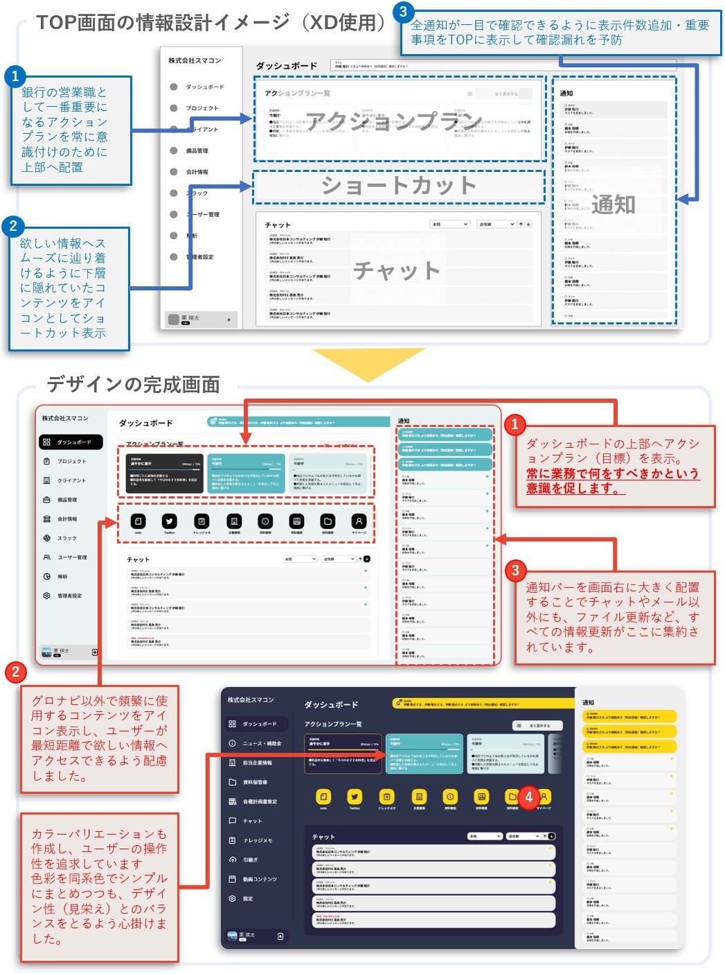 リテラシーが低い年配層(支店長等の管理職)に配慮しつつも、メインユーザーである若手営業職(20~30代)の利用モチベーションが上がる見栄えのするデザインにしてほしい。UXを意識したUI設計が欲しい。