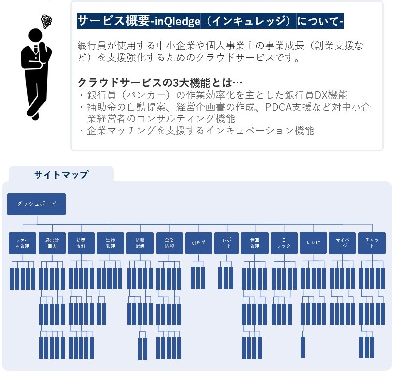 銀行業務でのDX化が上手く進んでおらずアナログな作業で営業職の業務がひっ迫している問題があり、それを解消する手段として誕生した業務支援SaaSが「InQledge」である。このSaaSの全画面(165ページ)のUI制作が本件の依頼内容である。