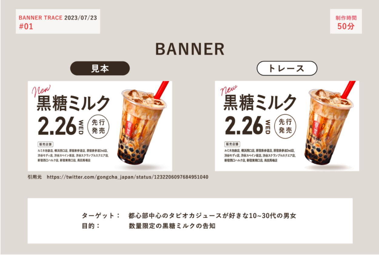 SHElikes MULTI CREATOR PROJECTの課題にて「Gong cha」の新作商品の広告宣伝として、Twitter版のバナートレースをいたしました。