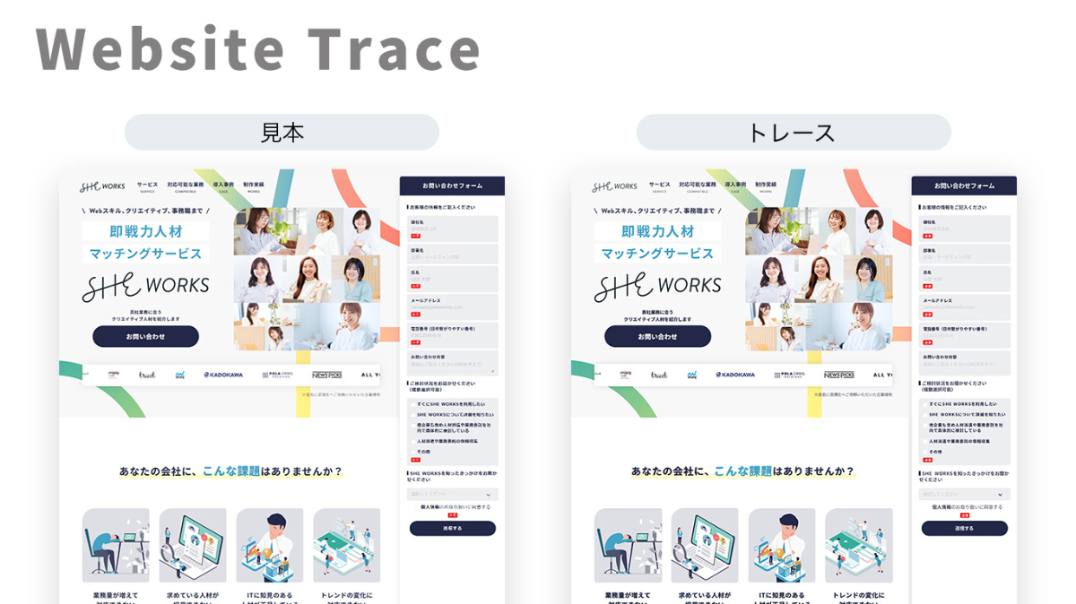 見本となるWebサイト(SHE WORKS for BIZ(シーワークス)|https://sheworks.shelikes.jp/)について、検証ツールを使用してフォントや文字サイズ、色調、影の大きさ等を調査しながら遜色がないようトレースをした。なお、Webサ取り組んだる読みやすい文字のサイズやレイアウトの組み方、色の使い方はどのようなものかを観察しながら取り組んだ。