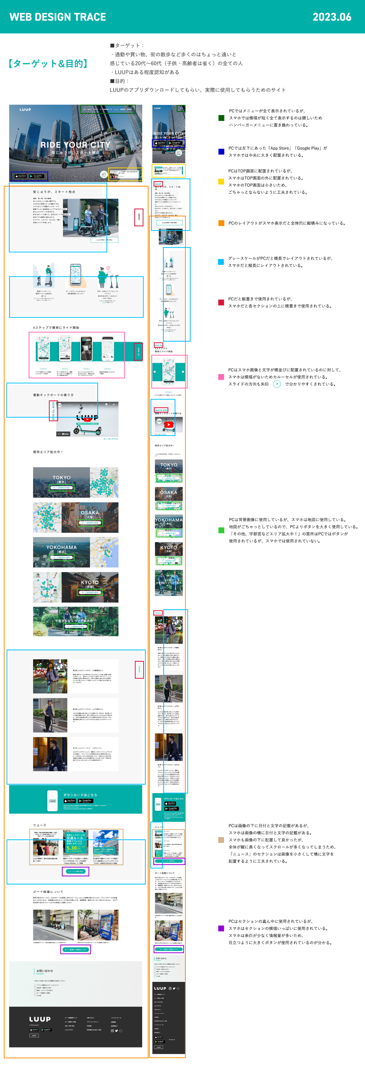 トレース、スタイルガイド、PCとスマホの異なる箇所の分析、全ての課題においてただ進めるのではなく、 ターゲットや目的を常に頭に入れながら、なぜこのデザインなのか、なぜここに使用するのか、見やすいデザインとは何なのか、思考しながら進めていきました。