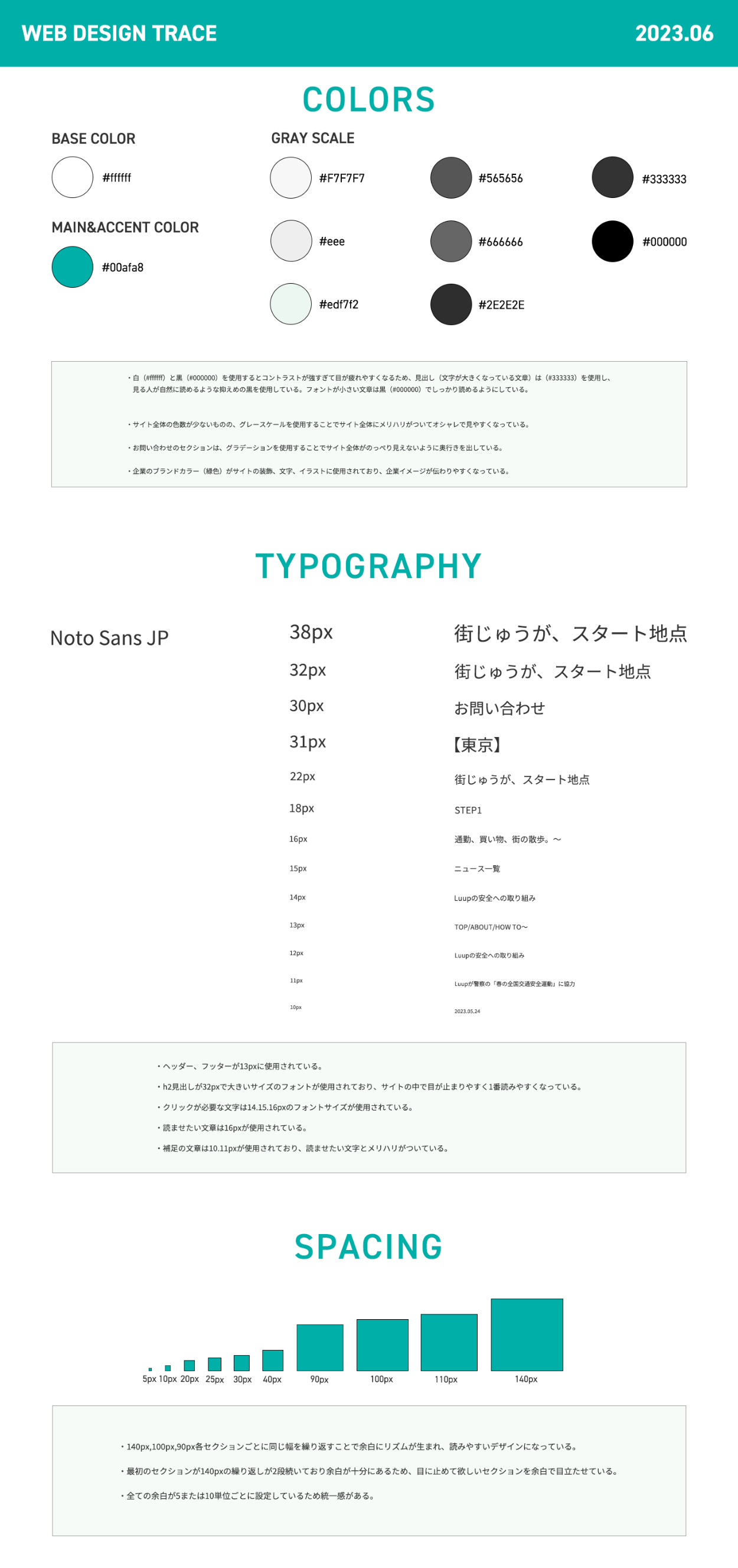 SHElikes MULTI CREATOR PROJECTにて、LPトレースに取り組みました。 LPトレースから、「目的」「ターゲット」を分析をして、「カラー」「タイポグラフィ」「余白」の分析結果をまとめたスタイルガイドの作成とPCとスマホの異なる箇所の分析を行いまとめました。