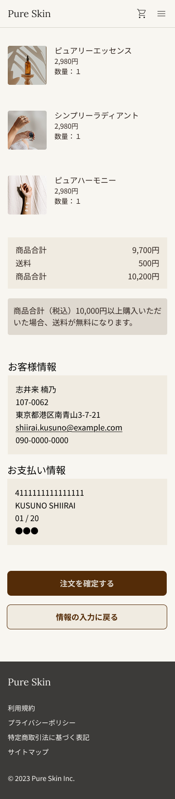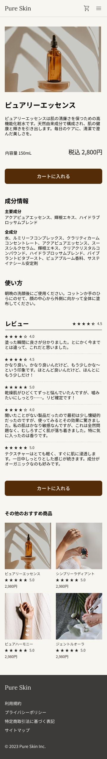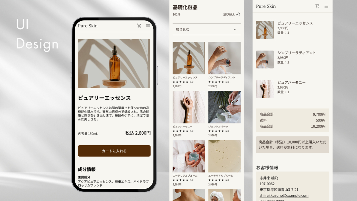 【自主制作】オーガニックスキンケアスマホ版ECサイト ゆう イラストレーター/デザイナー ▼商品の特徴・化学物質や合成成分は不使用・あくまで肌の健康を維持し本来の美しさを引き出す・製品だけでなく製造過程まで自然に寄り添う▼ターゲット要件定義_figma▼作業ファイル作業ファイル_figma