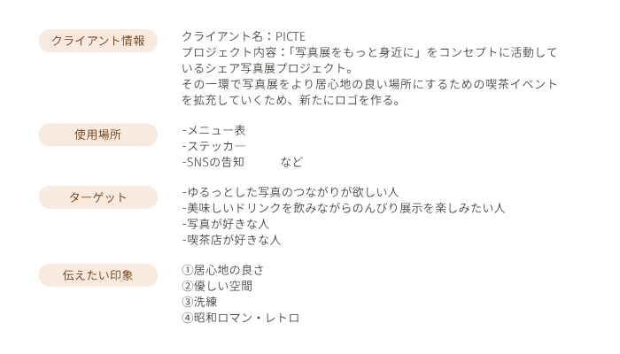 ・喫茶店×写真展という強みを魅せるため、ピの「〇」をカメラのレンズモチーフに。