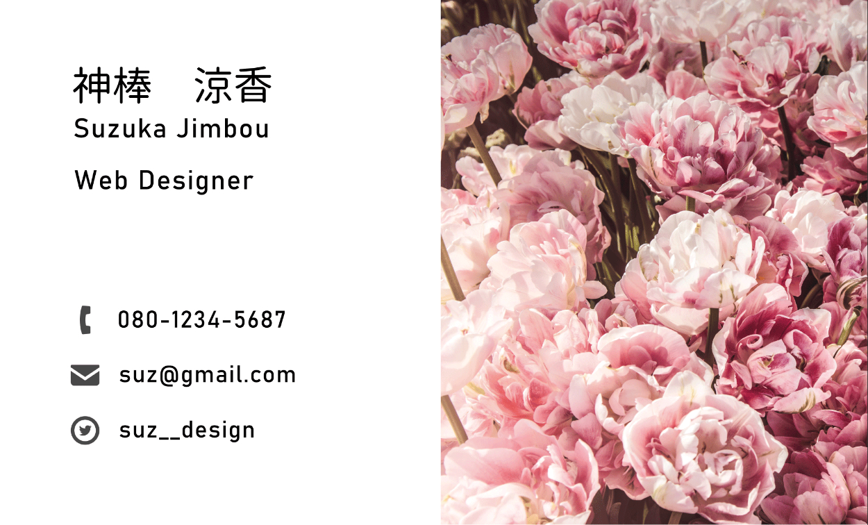 自主制作 名刺デザイン sᴜᴢ Webデザイナー OVERVIEW 自主制作にて名刺を作成しました。 YEAR 2021 ■表面■裏面◎こだわった部分表面は白地に黒字、フォントはいろはマルを使用して、プロフィール情報が見やすく目立つように配慮しました。裏面はピンクカラーと花のイラストで女性らしさを演出し、得意な世界観を表現しました。