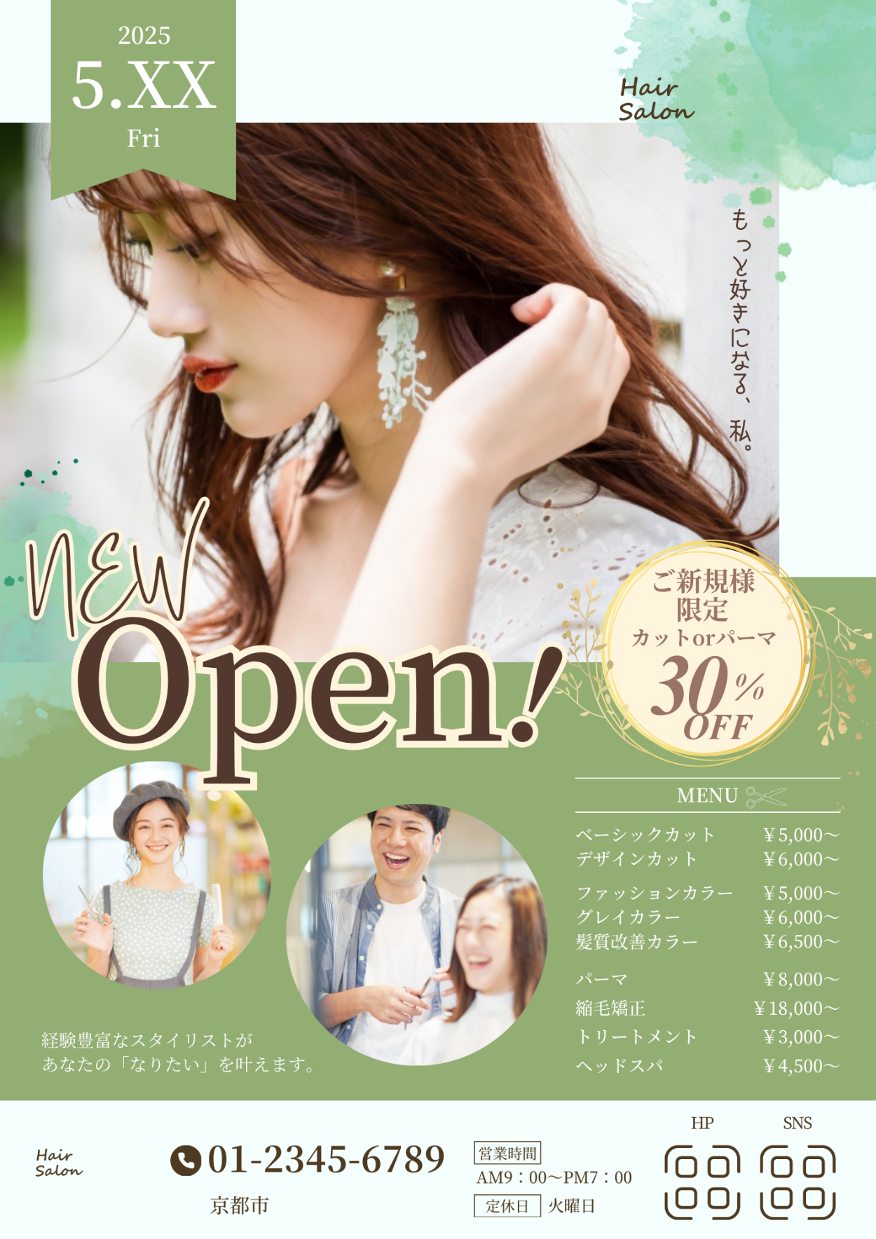 これからオープンされる美容室のオープンに合わせて、 チラシ作成の依頼をいただきましたので クライアント様と打ち合わせ前にサンプルを作成しました♡ ※クライアントからの要望はまだ聞いていない段階で作成しています。 作成時間:1時間半