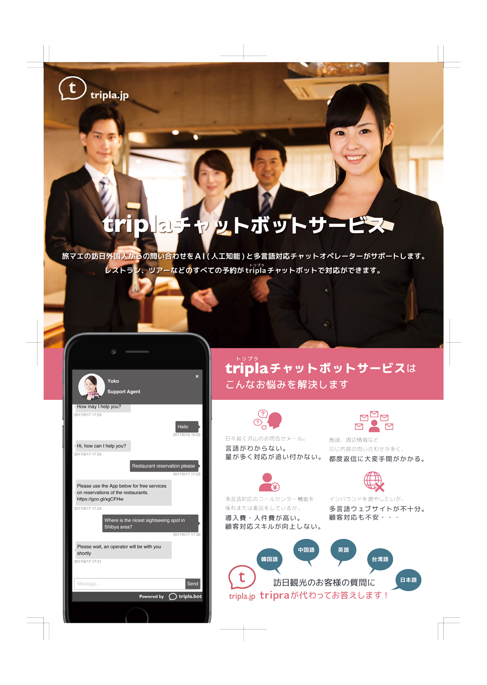 tripla チャットボットサービス フライヤー iwashita yoshiko グラフィックデザイナー OVERVIEW 旅行代理店triplaでのチャットボットサービスのフライヤーを作成致しました。
